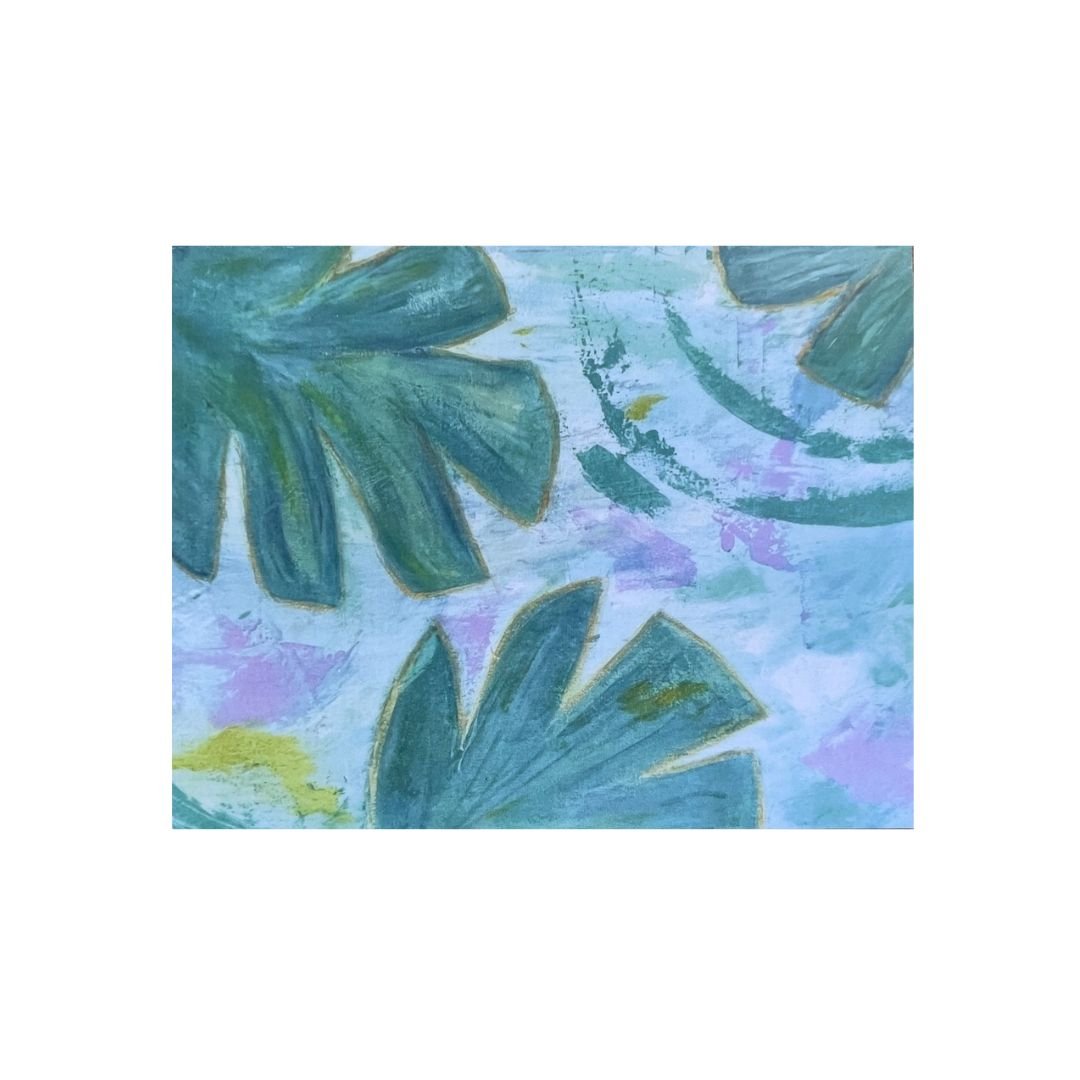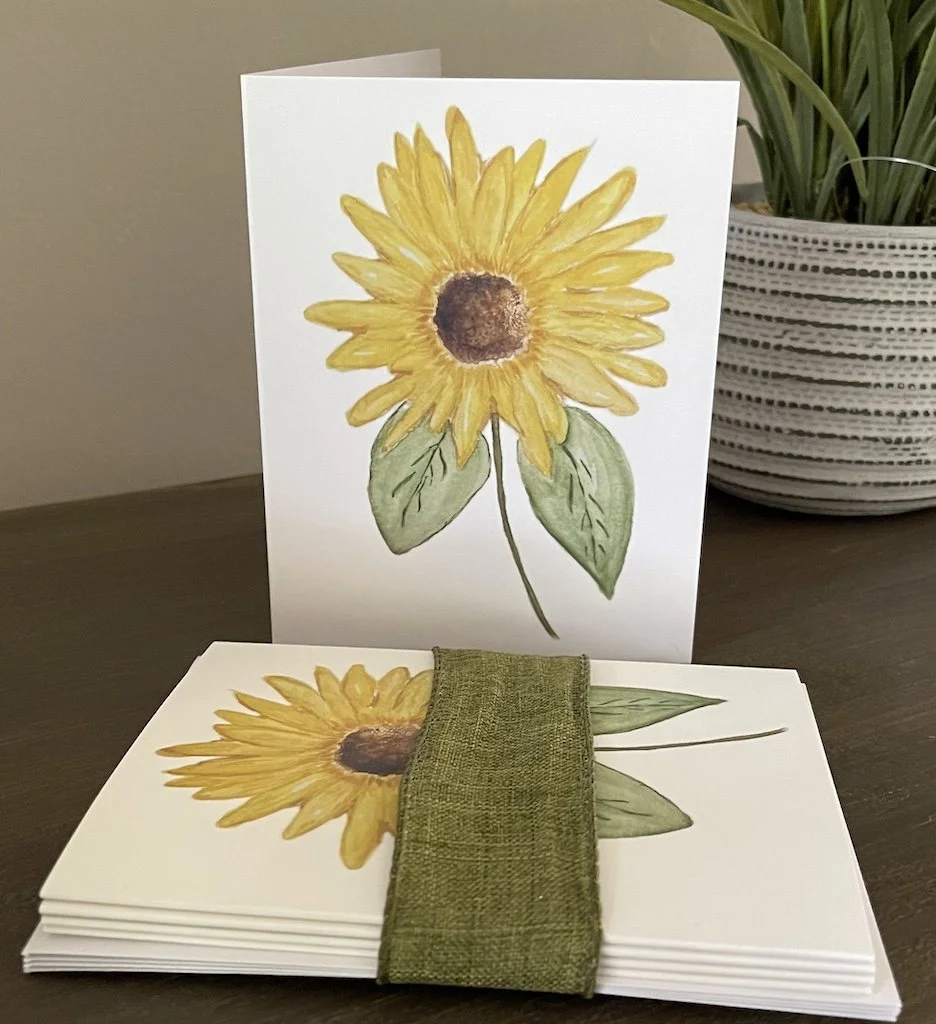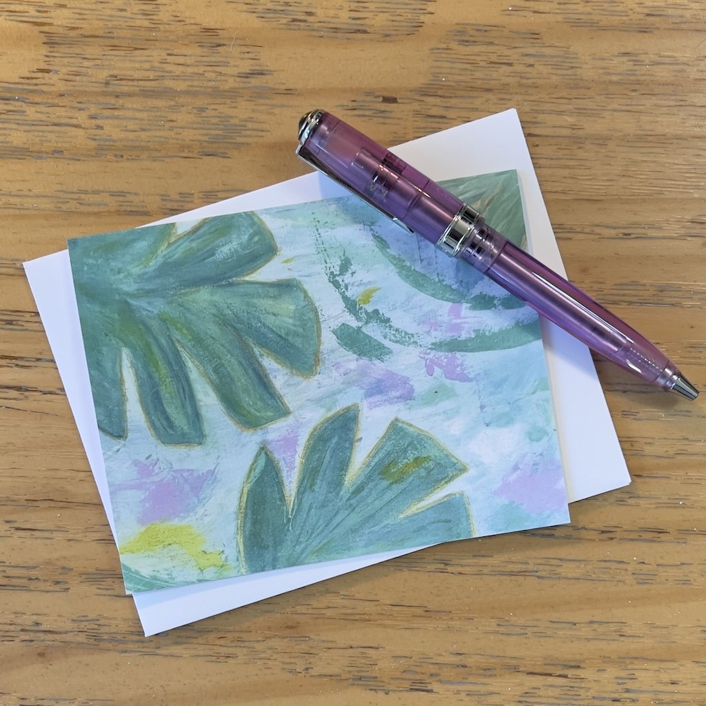 Hand-painted acrylic on canvas design that has been digitalized and printed on premium matte card stock. Folded note card is blank inside and measures 4 × 6” and includes a white envelope.